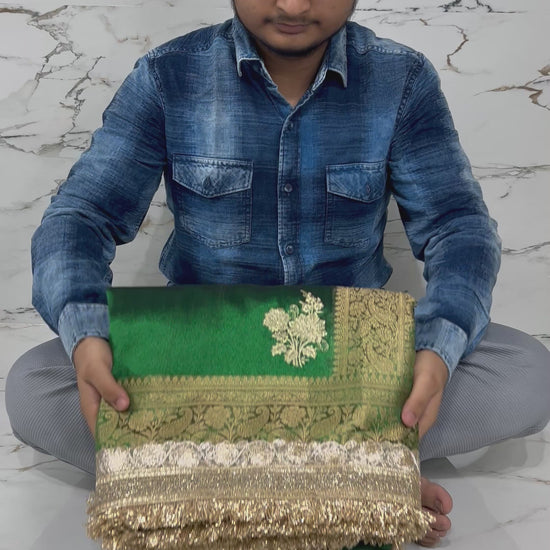 Banarasi sarees are traditional Indian sarees that are known for their luxurious fabric and intricate designs. They are made in the city of Varanasi, also known as Banaras, and are typically made from fine silk. The sarees can feature elaborate patterns woven with gold or silver threads, including floral designs, paisleys, and scenes from Hindu mythology. The craftsmanship of Banarasi sarees is considered to be some of the finest in the world, with many sarees taking weeks or even months to produce. Banarasi sarees are often considered to be a symbol of wealth and prestige, and are traditionally worn on special occasions such as weddings, festivals, and religious ceremonies. Their timeless elegance and intricate beauty make them a popular choice for both Indian and international audiences.